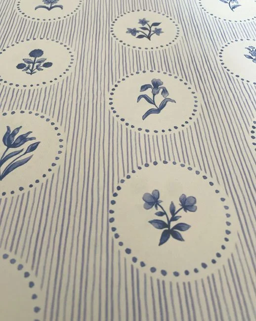 Inspired by the Mughal miniatures from a trip to the V&A Museum, I’ve hand-painted 36 unique small wild flower motifs and silhouetted them to make the Cottage Ditsy wallpaper pattern, each one framed by a sea of dots.