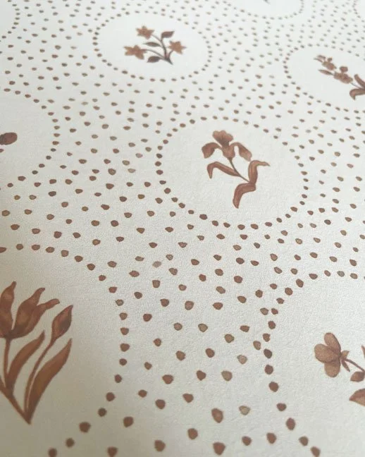 Drawing inspiration from Mughal miniature paintings from a trip to the V&A Museum, I’ve hand-painted 36 unique small wild flower motifs onto a background of ticking stripes, each framed by dots, to make the Cottage Ditsy wallpaper pattern.